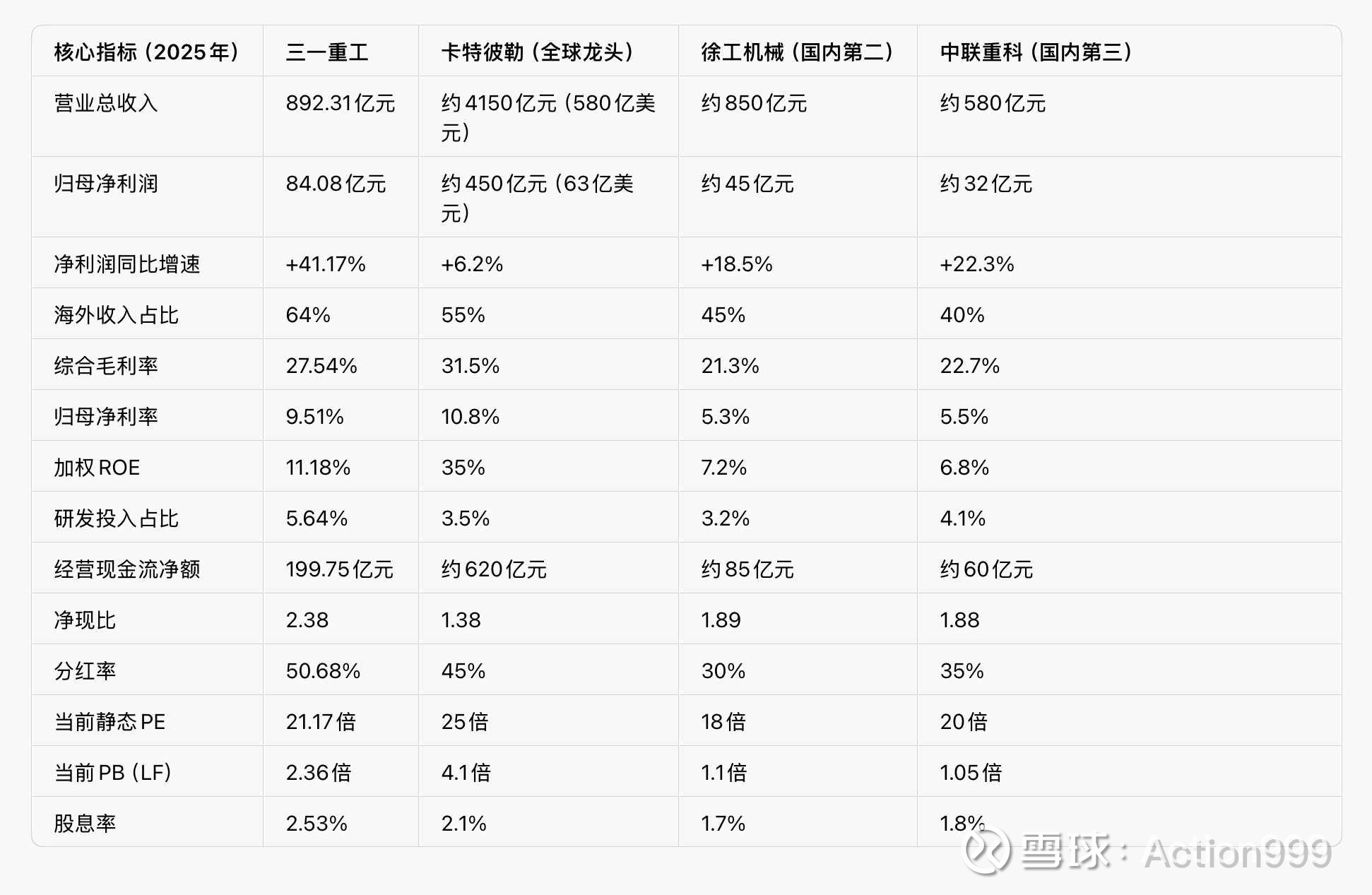 选取全球工程机械龙头卡特彼勒,国内龙头徐工机械、中联重科,从核心经营、盈利、估值、成长四大维度进行深度对比,清晰呈现三一重工的行业地位与竞争优势: