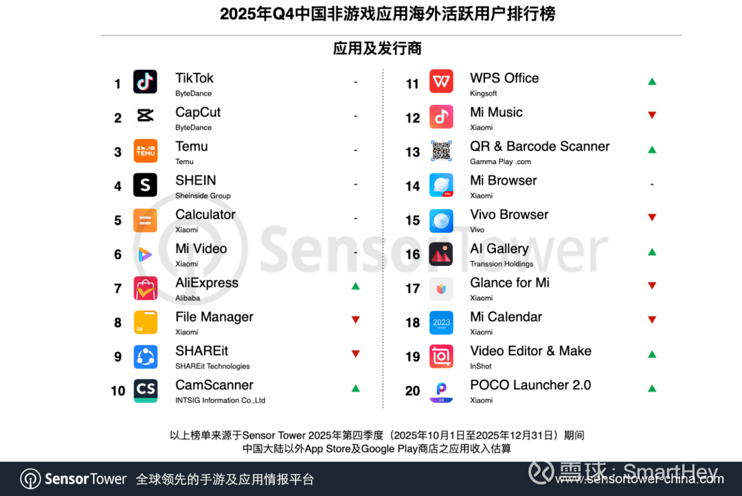 最后,硬件生态所构建的长期护城河依然稳固。以小米为代表的手机厂商,通过系统级工具应用在海外市场建立起高频、刚需的使用场景,为中国应用出海提供了持续且稳定的用户基础。