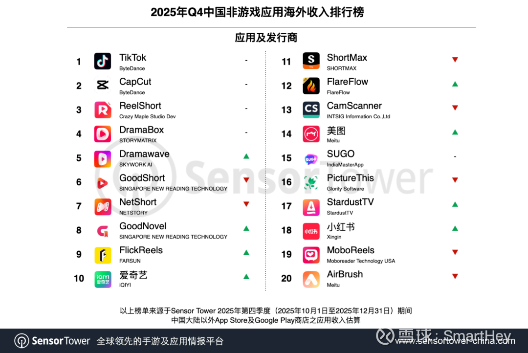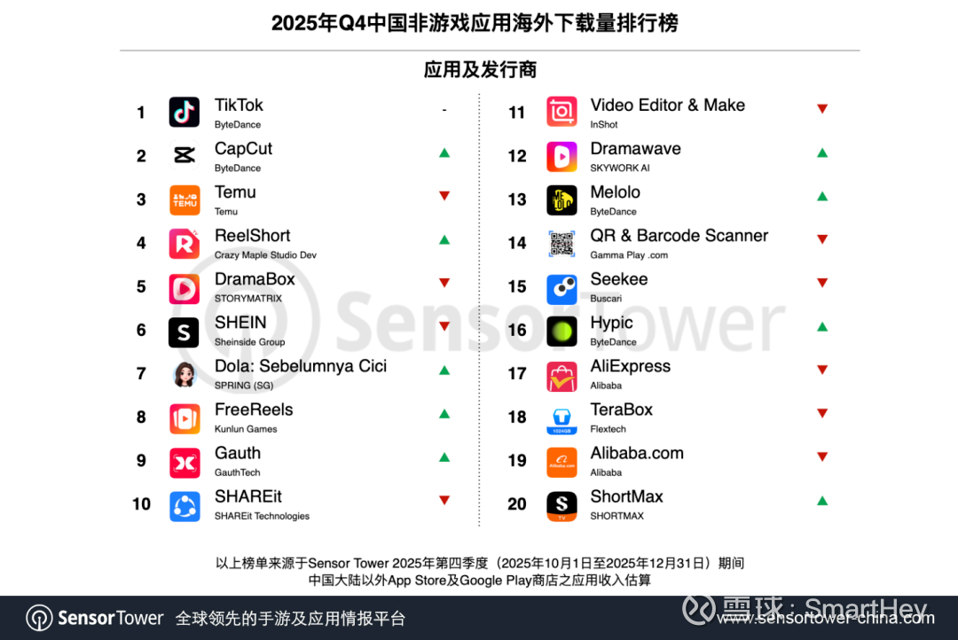Sensor Tower 最新数据显示,2025年第四季度(10月1日至12月31日,下称 “Q4”),非游戏移动应用在全球市场迎来强劲收官。字节跳动旗下 TikTok 与 CapCut 强势包揽非游戏出海收入榜、下载榜与 MAU 榜的冠亚军席位,成为本季度最具代表性的全球化应用组合。