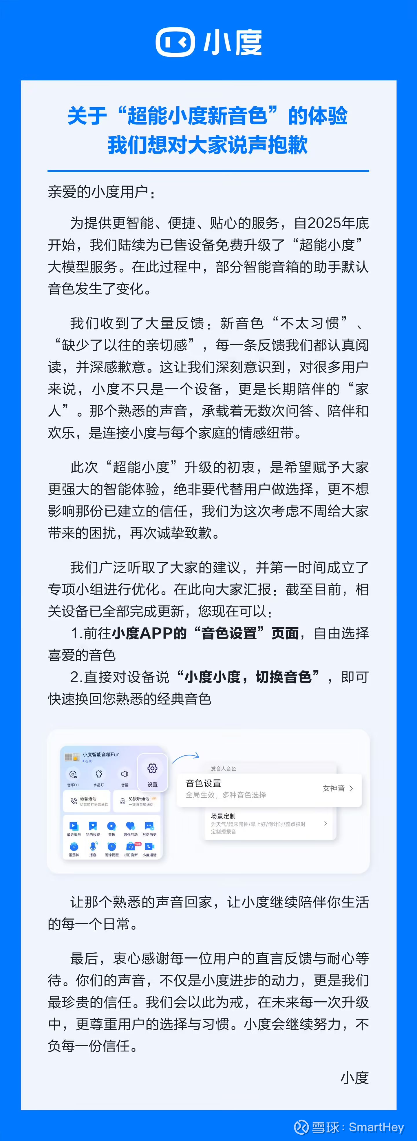今天上午,百度旗下“小度小度”官微发布致歉信称,2025 年底开始陆续为已售设备免费升级“超能小度”大模型服务,部分智能音箱的助手默认音色发生变化,有用户反馈称新音色“不太习惯”“缺少了以往的亲切感”。