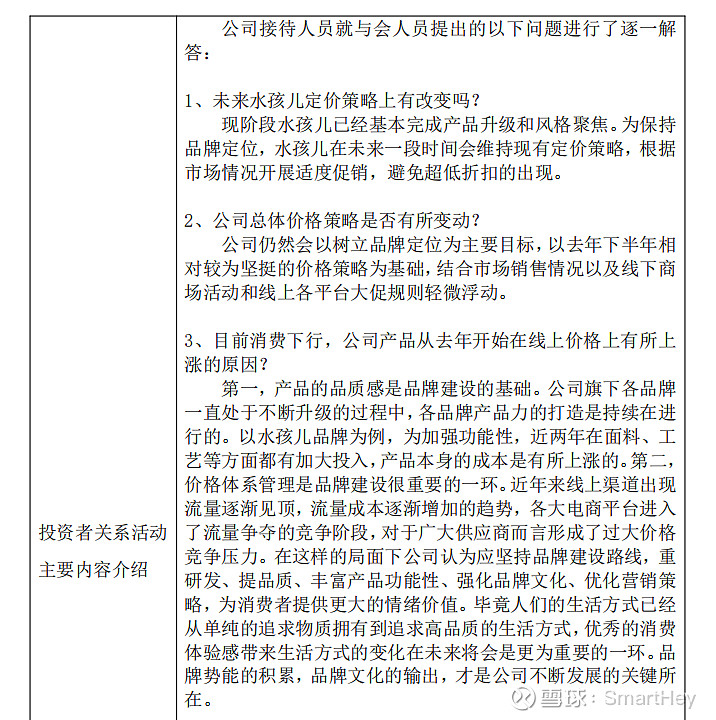 有关水孩儿的发展策略,在其母公司北京嘉曼服饰股份有限公司2025年的一份投资者关系活动记录表中,可以窥见其部分官方答案。在这份交流记录里,当与会人员问及“未来水孩儿定价策略上有改变吗”,其母公司给出的回应是,“现阶段水孩儿已经基本完成产品升级和风格聚焦。为保持品牌定位,水孩儿在未来一段时间会维持现有定价策略,根据市场情况开展适度促销,避免超低折扣的出现。”