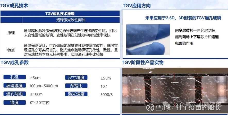 AI芯片封装:替代CoWoS中的硅中介层,解决GPU散热瓶颈(如英伟达H100)。 高频光通信:CPO(共封装光学)中实现光电信号高效互联。 Micro LED显示:玻璃基MIP封装载板(通格微)降低芯片成本50%,像素间距缩小。 2.5D/3D先进封装:临时键合载板用于晶圆减薄至50μm以下(熠铎科技)。