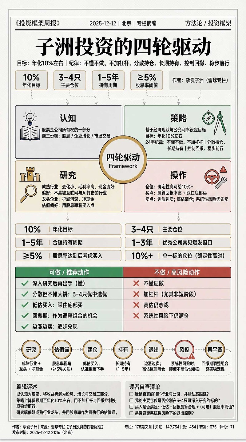 基于经济现状,公允利率,制定合理的年化收益率目标,目前我的目标是10%左右。 对于股票投资方面的策略,可以用24个字代替。24字如下:“不懂不做、不加杠杆”、“分散持仓、长期持有”、“控制回撤,稳步前行”。