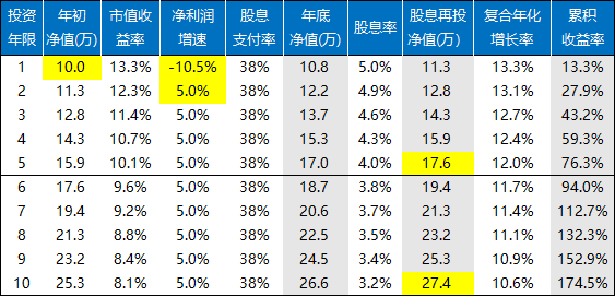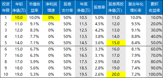 为便于理解长期投资获益的基础逻辑,先做几个极端假设:某企业的营收和净利润未来零增长,企业市值=企业价值。那么,每10万元的投资组合,买入时市值收益率为10%(10倍市盈率),未来投资收益可能是如下情况,十年一倍。