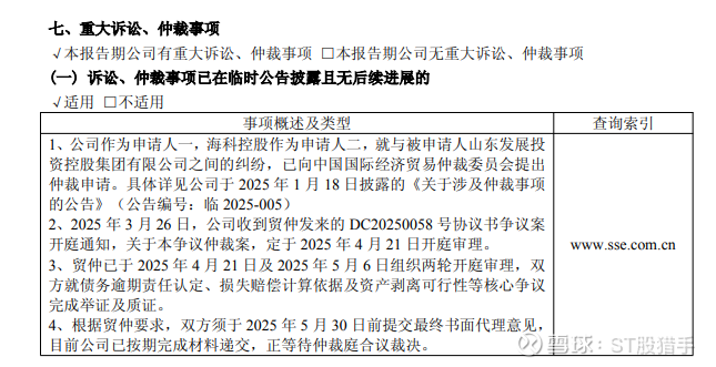 本次仲裁案件,目前的进展是根据中国国际经济贸易仲裁委员会(英文简称CIETAC,中文简称“贸仲委”)要求,双方须于 2025年5月30 日前提交最终书面代理意见,目前公司已按期完成材料递交,正等待仲裁庭合议裁决。截至财务报告批准报出日,正等待仲裁庭合议裁决,后续审理结果存在不确定性,对公司的影响尚存在不确定性。
