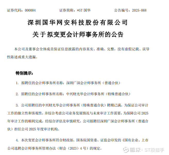 9 月 12 日周五盘后,*ST 国华发布了数则公告,其中《*ST 国华:关于拟变更会计师事务所的公告》格外吸睛。