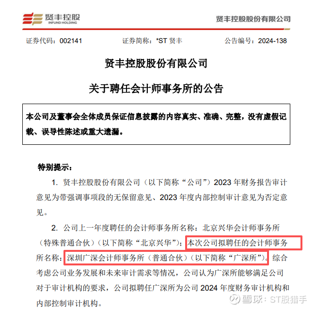 更换会计师事务所:公司在2024年12月聘任深圳广深会计师事务所为年报审计机构,由此,2024年报*st贤丰公司顺利取得了标准审计意见,四季度集中确认的4亿营业收入,也未在营业收入扣除情况的专项审核报告中被扣除,公司同步向交易所申请撤销退市风险警示。最终成功摘帽。