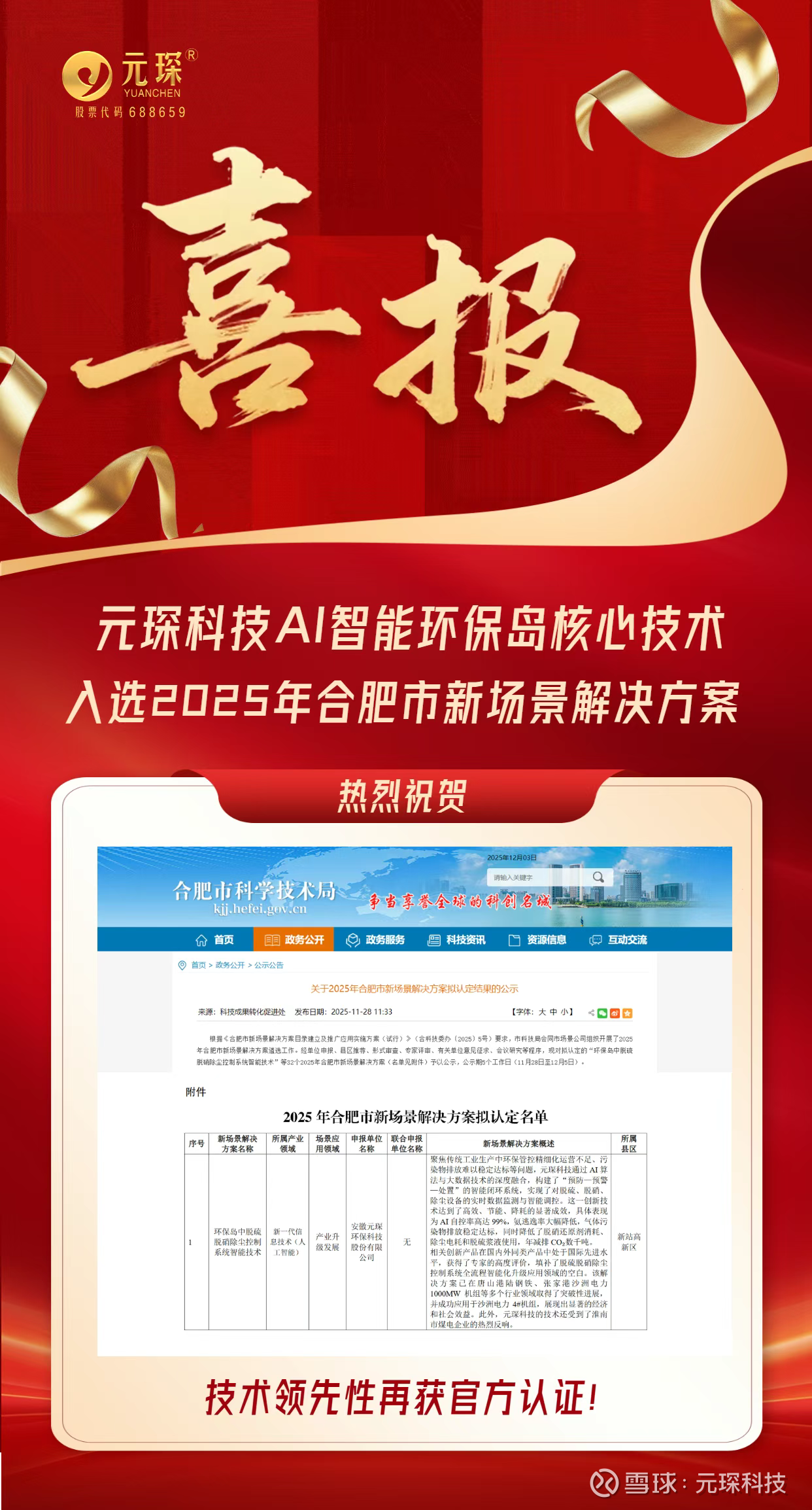 元琛科技“环保岛中脱硫脱硝除尘控制系统智能技术”成功入选2025年合肥市新场景解决方案!