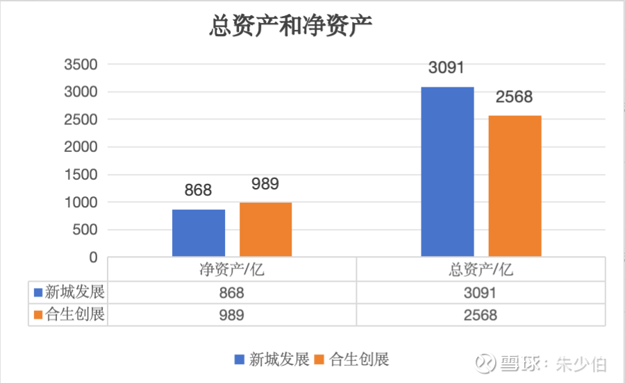 1.1 新城的总资产3091亿,高出合生523亿,但在净资产方面合生比新城高出121亿,原因是新城的负债较高,所以净资产低于合生。
