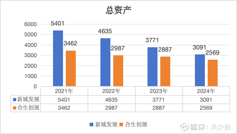 1.3 一个值得关注的点近几年新城发展的总资产从5401亿降至3091,直接下降了近43%,主要原因是销售额的急剧下降。合生的总资产则在2021年基础上下降26%。相对前者温和得多。