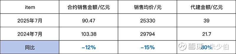 合生创展截至2025年7月31日销售金额、销售均价、代建金额对比。