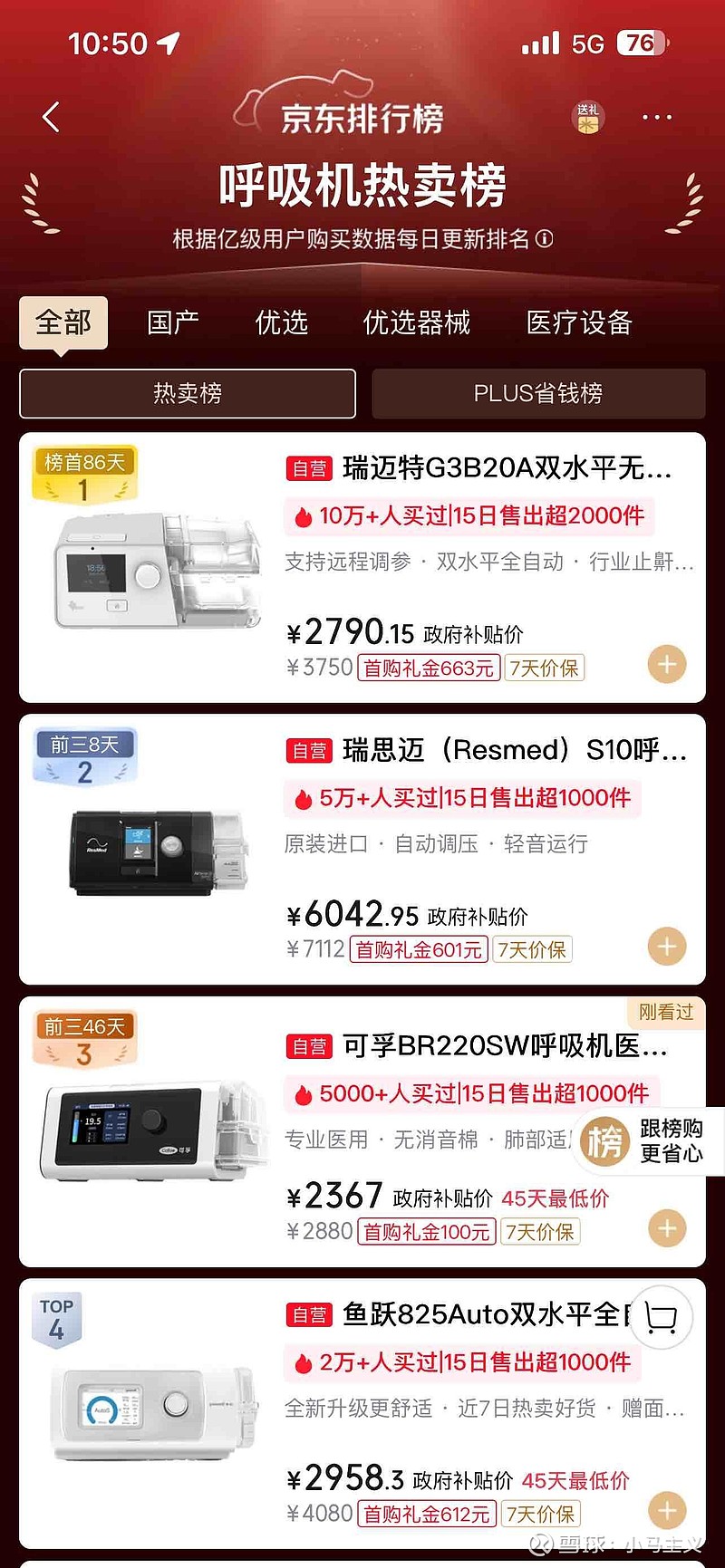 $瑞迈特(SZ301367)$ 感觉和$可孚医疗(SZ301087)$ 进入价格战阶段,从京东上的表现来看。技术上,瑞迈特 应该更好,可孚渠道和营销占优,尤其抖音上那些素人使用体验,满满活人感。目前国内前四就是瑞迈特、瑞思迈、可孚和鱼跃,后两者呼吸机不是主营业务,但份额在提升,增长也挺快,自然公司会倾斜资源到上面。