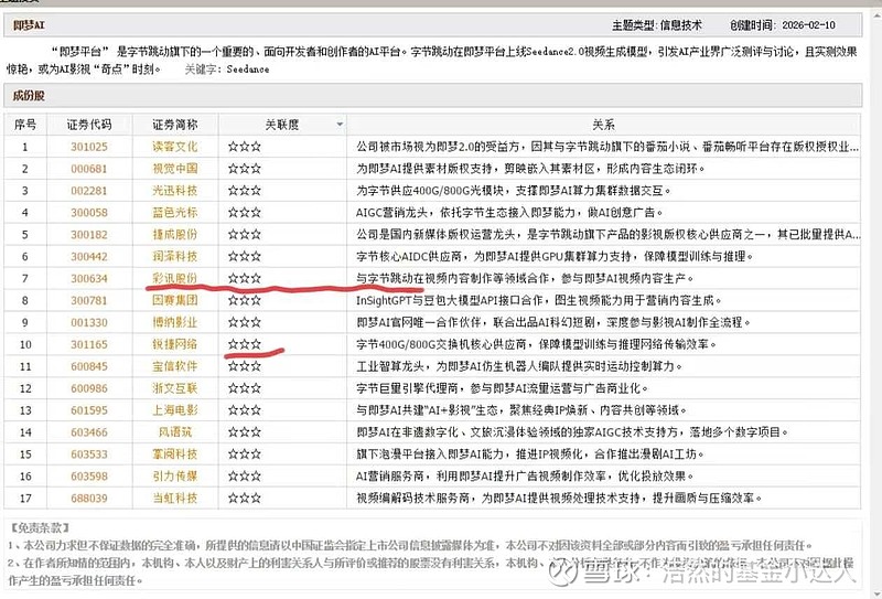 - 在即梦AI生态中,彩讯股份属于中游技术支持方,与上游算力供应商(如宝信软件)、下游应用方(如博纳影业)形成协同。其关联度被标注为“☆☆☆”高评级,且被红色横线重点提示,表明其在产业链中的重要作用!