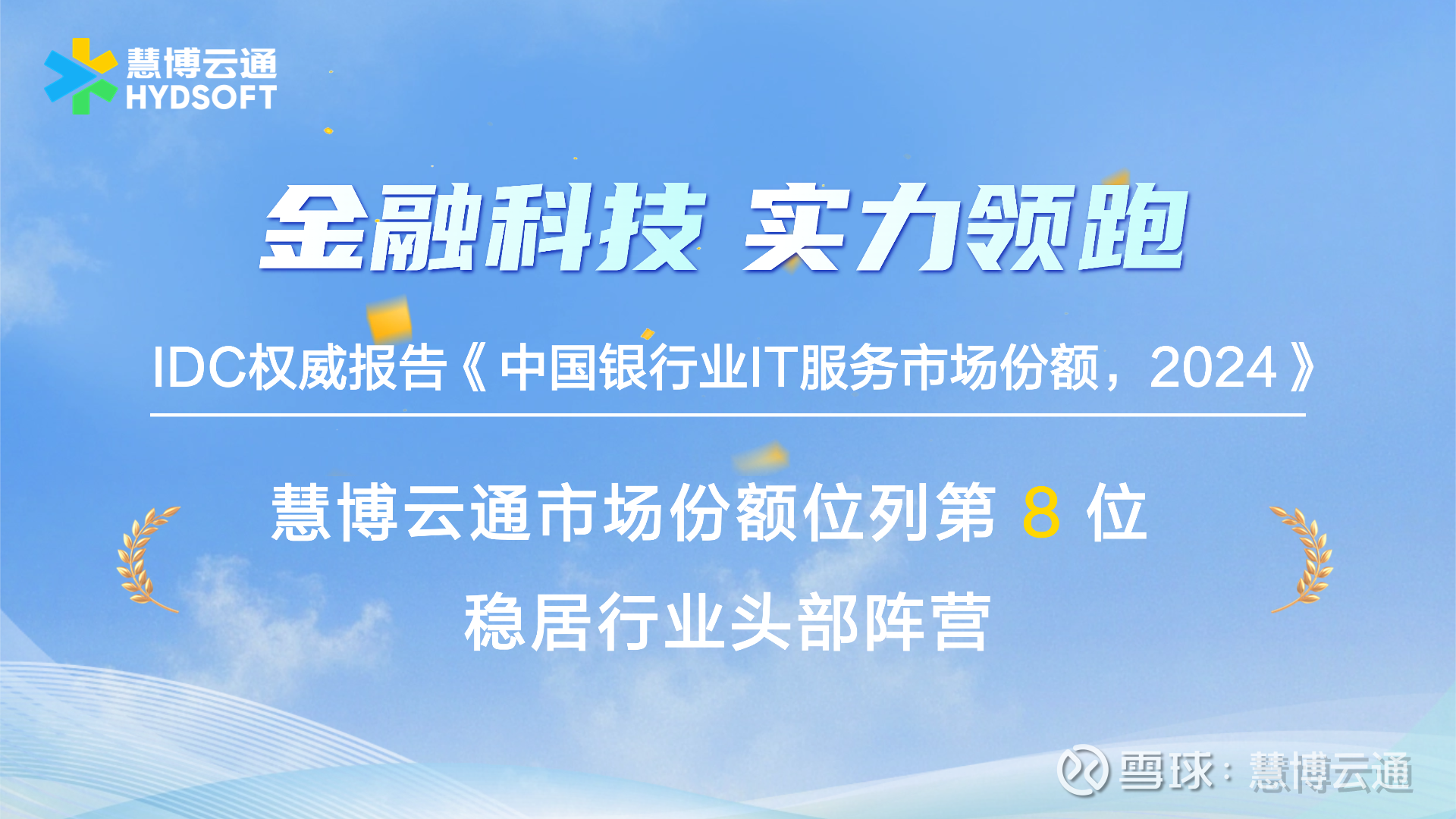 近日,国际数据公司(IDC)发布了《中国银行业IT服务市场份额,2024》权威报告。该报告是IDC首次针对中国银行业IT服务市场推出的专业调研评估,对当前中国银行业IT服务市场格局进行了全面深入分析,慧博云通的市场份额在报告中位列第八位,稳居行业头部阵营。