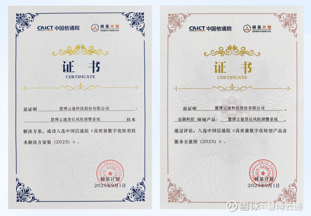 面向金融行业数字化转型需求,慧博云通打造了多款优质产品与解决方案,涵盖新一代数智化信贷业务平台、贷后风险预警系统、智能营销平台、统一监管报送平台、智能财务管理系统、数智协同办公平台等创新产品,已在众多金融机构成功落地,持续以专业实力赋能金融业务创新。今年9月,慧博云通“贷后风险预警系统”等解决方案成功入选中国信息通信研究院《高质量数字化转型技术解决方案集(2025)》、《高质量数字化转型产品及服务全景图(2025)》,再次印证了行业客户和权威机构对慧博云通技术成果的高度评价与认可。