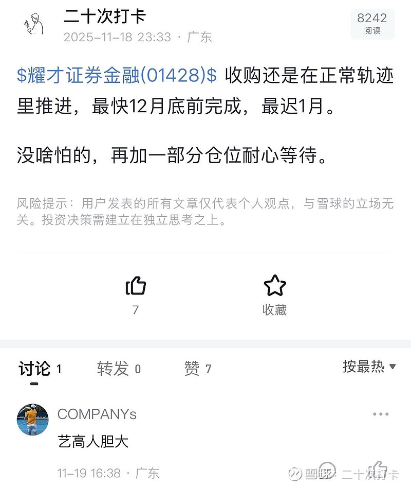 $耀才证券金融(01428)$ 已达成90%收购条件,目前仅待发改委审批完成最后一步。预计完成时间在12月底前,明年2月进港股通。9元开始建仓,下跌过程中持续买入,目前占总仓位40%。赔率合适,接受一定比率的不确定性。