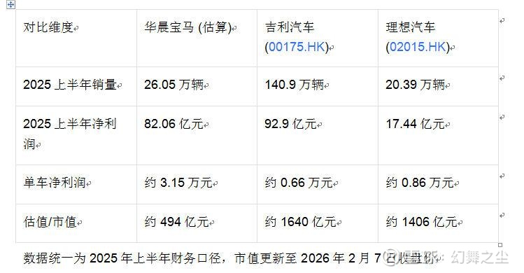 将华晨宝马视为独立公司,与吉利汽车、理想汽车进行同口径对比,能清晰揭示市场的定价逻辑。