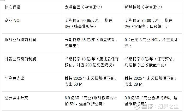 1. 关于商业NOI与服务利润:龙湖90-95亿商业NOI基于现有商业租金收入推算,45亿服务业务税前利润由其独立核算的服务收入口径推导,均为保守值;新城因租金+服务合并核算,商业NOI已包含服务利润,不重复计算,贴合年报统计口径。