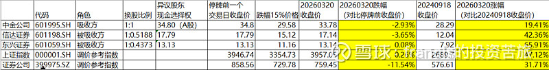 3、三只股票中,中金公司现金选择权调价风险最小,毕竟触发调价时,本轮行情涨幅只剩下5%,也严重跑输指数。即使重组失败安全垫也最厚。