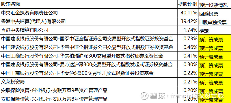 这里仅以中金公司为例,按《公司法》要求,公司合并、分立、解散或者变更公司形式的决议,必须经代表三分之二以上表决权的股东通过,即AH股各自股东会三分之二通过。中金公司合并前前10大股东分布如下: