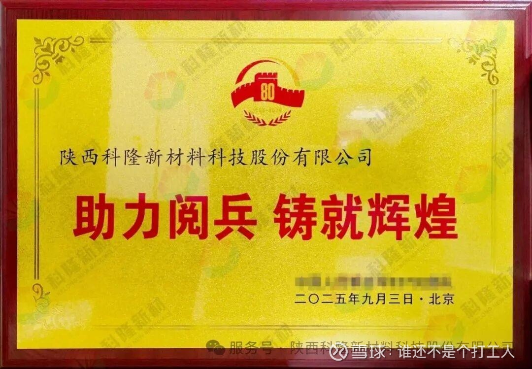 在纪念中国人民抗日战争暨世界反法西斯战争胜利80周年阅兵盛典上,陕西科隆新材料科技股份有限公司$科隆新材(BJ920098)$(股票代码:920098)凭借卓越的装备保障贡献,荣获"技术精湛,保障一流"、"助力阅兵,铸就辉煌"等多项荣誉称号,并获得某方队授予的"军民同心筑防线,精研细鉴强装备"锦旗。这些国家级荣誉不仅是对公司技术实力的高度认可,更是对其从煤矿机械向军工领域战略升级成果的充分肯定,标志着公司在军工赛道实现了重大突破。