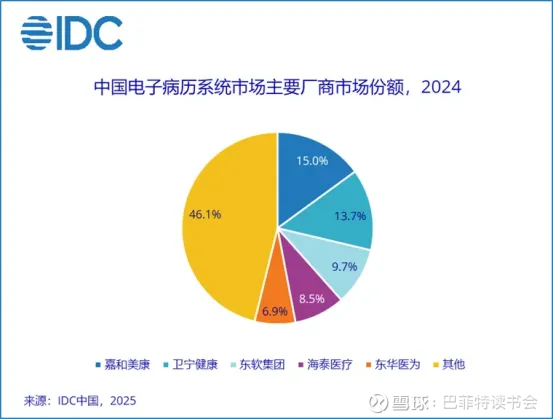 从2024年电子病历领域竞争格局看,嘉和美康占15%,卫宁健康占13.7%,东软集团占9.7%,海泰医疗占8.5%。