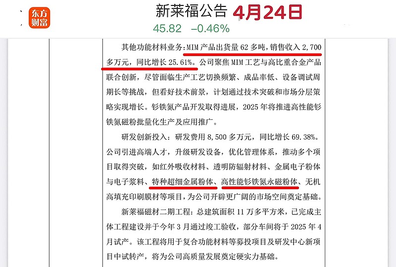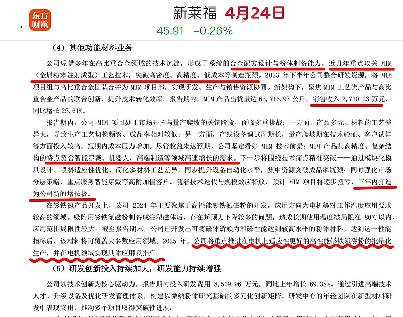 新莱福 :2024年年报,金属注射成形(MIM)产品出货量62多吨,销售收入2,700多万元。(海昌新材MIM营收2529万元)