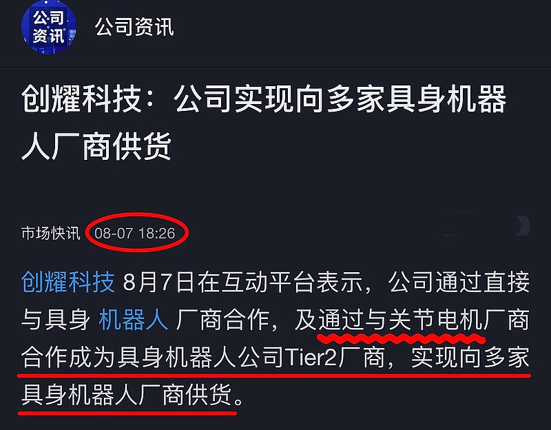创耀科技:8月7日盘后互动平台表示,公司通过直接与具身机器人厂商合作,及通过与关节电机厂商合作成为具身机器人公司Tier2厂商,实现向多家具身机器人厂商供货。