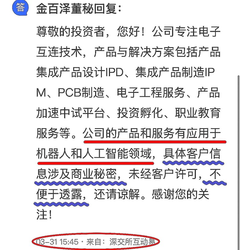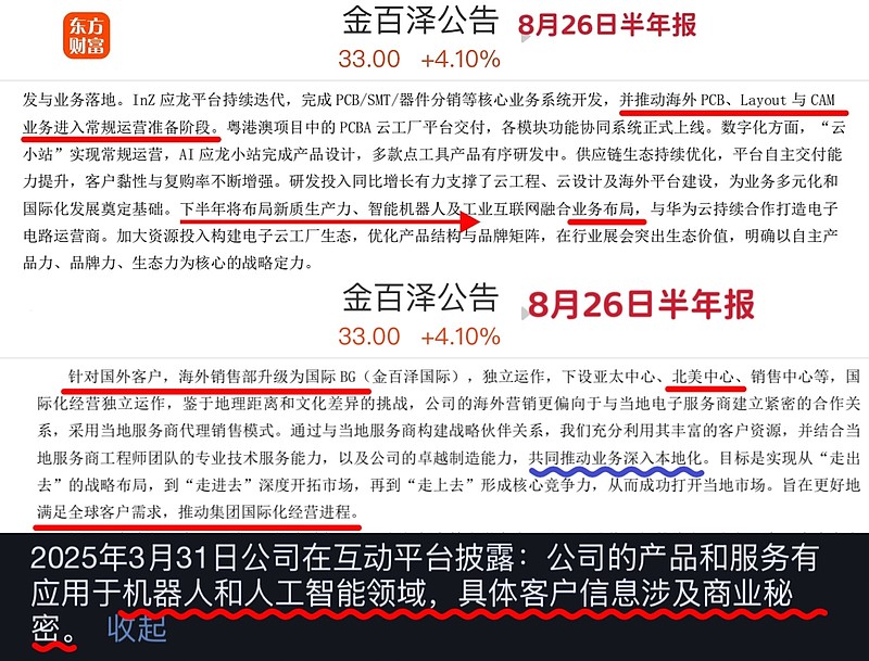 涉及商业秘密原因,又是下半年的业务布局,所以在上半年报中没重点表述,海外PCB、Layout 与CAM配合富士康(包括北美区、半年报也透露设立北美部),为全球制造英伟达机器人己进入运营准备阶段,下半年配合富士康全球首发!全球配套、全市唯一!无比珍贵!