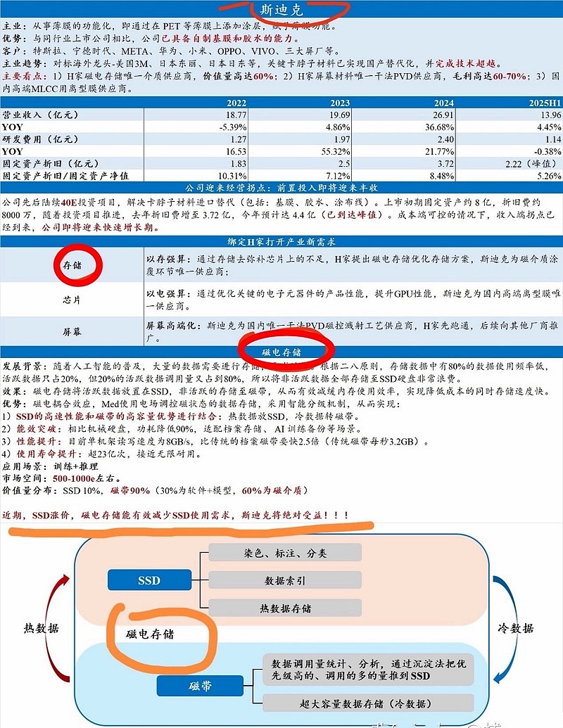 契合 Hw公司:突破传统磁电存储 “仅适用于冷数据” 的局限,实现 “冷热数据兼顾” 的技术能力,与 H 公司 2025 年 3 月提出的 “替代 SSD” 战略目标高度契合。据 H 公司内部判断,磁电存储市场空间超千亿,而斯迪克正通过 “嵌入式研发” 模式与终端客户联合攻关,技术产业化落地赶进谷哥。