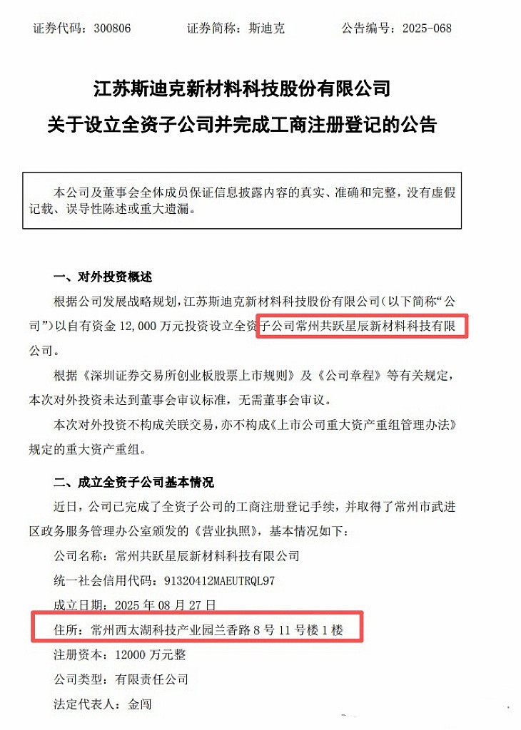 2025 年 8 月 27 日,斯迪克公告以 1.2 亿元自有资金设立全资子公司 —— 常州共跃星辰新材料科技有限公司,此次布局释放三大关键信号,直指磁电存储与 H 公司生态合作: