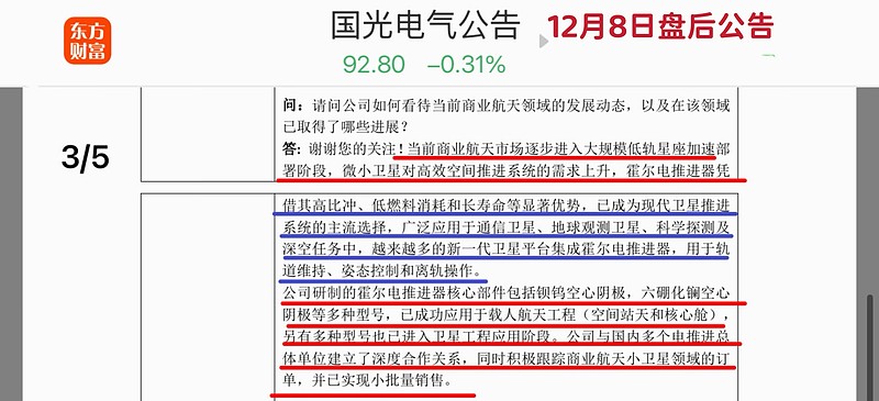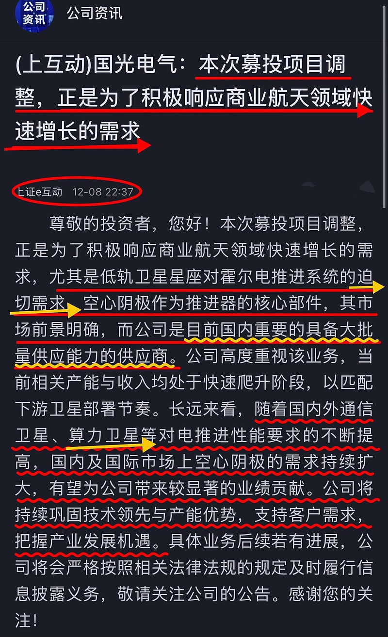 国光电气 :12月8日盘后互动平台表示,公司本次募投项目调整,正是为了积极响应商业航天领域快速增长的需求,包括通信卫星和算力卫星,尤其是低轨卫星星座对霍尔电推进系统的迫切需求。其市场前景明确,而公司是目前国内重要的具备大批量供应能力的供应商。