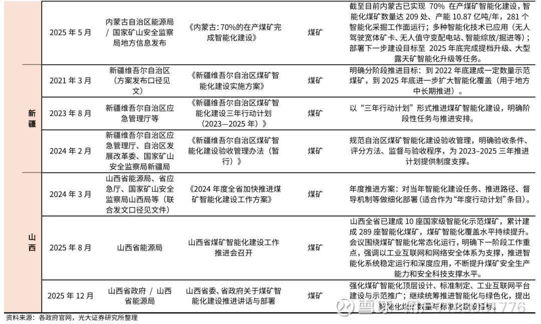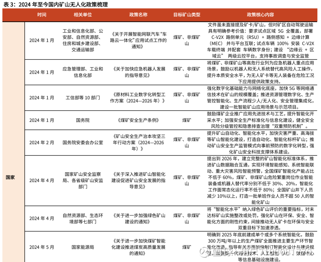 我们判断,2024年以来矿山智能化政策加速释放,正与产业形成共振:1)国家政策从“方向指引”转向“量化约束+标准规范”,将智能化水平纳入绿色矿山评价、明确高危岗位智能化替代率,为无人矿卡等装备打开市场空间;2)地方各省已进入“试点验收+规模化推广”阶段,多地明确智能化煤矿数量、无人装备覆盖率等具体目标,有望带动区域内矿山智能化需求集中释放。
