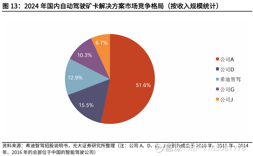 无人矿卡产业链主要涵盖专业技术解决方案商、传统主机厂与跨界科技企业三大阵营,以希迪智驾、易控智驾为代表的专业技术解决方案商,通过输出无人矿卡系统方案,与传统主机厂、采矿企业协同,助力下游矿山实现安全提效与降本。2024年国内自动驾驶矿卡解决方案市场呈现头部集中特征,按收入计,公司A以51.6%的份额占据主导地位,希迪智驾以12.9%的份额跻身第三,行业当前处于头部企业快速拓展的阶段。