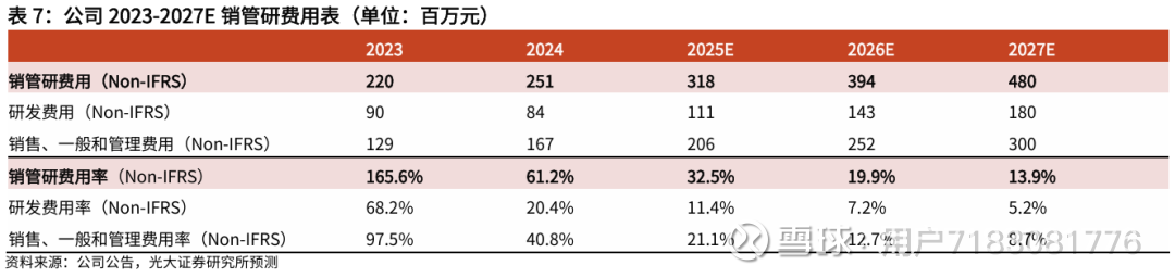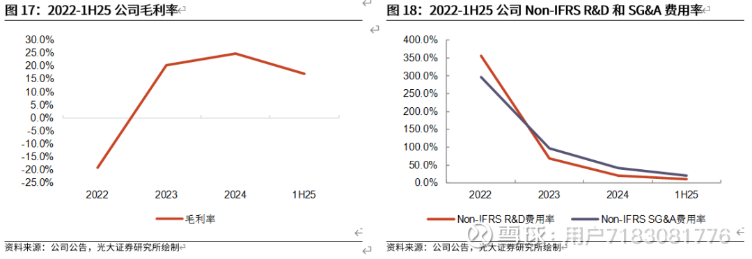2024年公司Non-IFRS SG&A费用率同比-56.6pcts至40.8%;1H25公司Non-IFRS SG&A费用率同比-9.9pcts至20.9%。考虑到公司后续业务拓展或带来SG&A费用增加,但收入规模的扩张将摊薄费用率,我们预计2025E/2026E/2027E公司Non-IFRS SG&A费用率分别为21.1%/12.7%/8.7%。