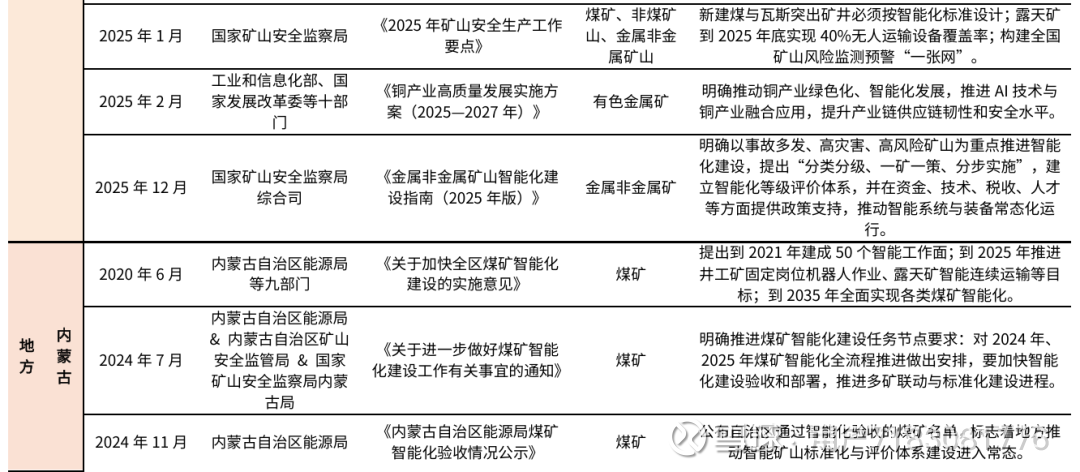 国内矿山智能化政策已形成国家与地方协同推进的格局:1)国家:政策明确了量化目标,如2026年全国煤矿智能化产能占比不低于60%、露天矿2025年底实现40%无人运输设备覆盖率等;2)地方:内蒙古、山西、新疆等地通过细化任务节点、建立验收标准等方式,推动政策从框架走向落地。
