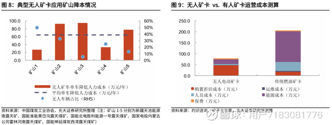 2)成本:传统采矿面临劳动力老化(60%以上工人超40岁)、用工成本高(每辆矿卡通常需要2-3名驾驶员确保正常运行)的痛点,无人矿卡可实现“无人化”操作、从而大幅降低人力成本(已应用无人矿卡的五座矿山平均单车降低人力成本约65万元/年)。此外,无人矿卡以增程/纯电动力形式为主,与传统燃油有人矿卡相比,运维和能源成本也大幅减少,我们测算,纯电无人矿卡每年单车运营成本相比燃油有人矿卡可节省62%。