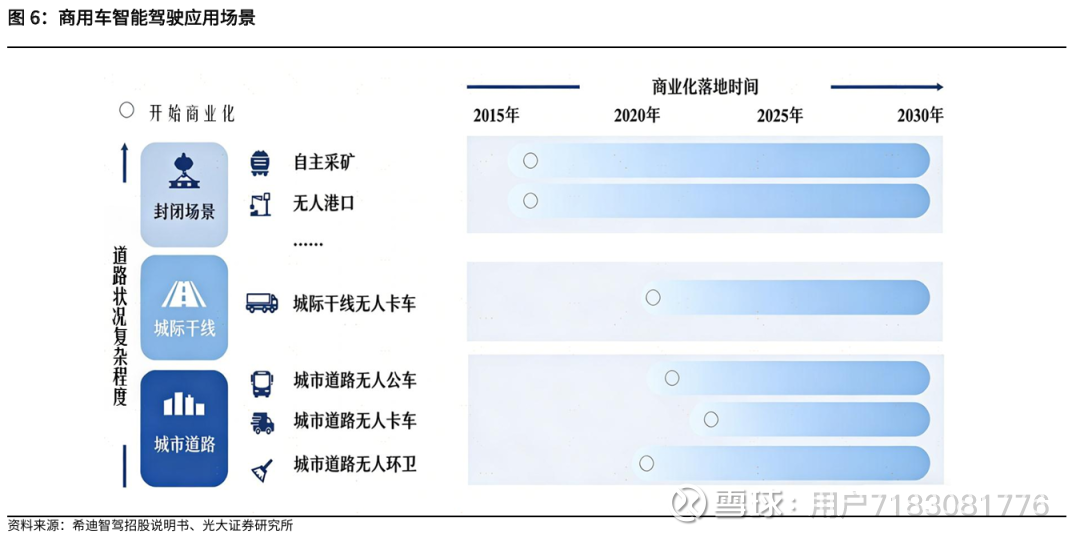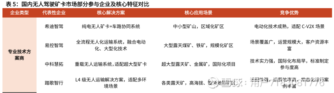 我们判断,1)矿场作为封闭场景的典型代表,其作业环境具备高风险、高污染、偏远且规模庞大的特点,对无人化的需求最为迫切,是智能驾驶商用车的刚性需求市场。2)商用车智能驾驶应用场景中,矿场在技术适配性与政策支持度均处于领先地位,因此将成为 L4 及以上高阶自动驾驶在商用车领域最先实现规模放量的核心场景。