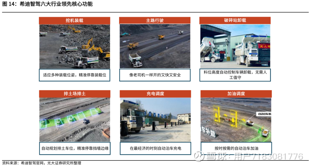 2)场景一体化适配能力强:希迪智驾具备覆盖全流程的六大核心功能(可实现挖机装载的多机位精准停靠、主路行驶的高效安全控制、破碎站卸载的自动制动、排土场的智能车位规划,同时配套充电/加油的自动调度)、更具备一体化适配能力。叠加其聚焦中小型矿山的纯电卡车+车路协同方案、电动化与C-V2X场景的适配性,技术与场景的双重壁垒或持续强化。