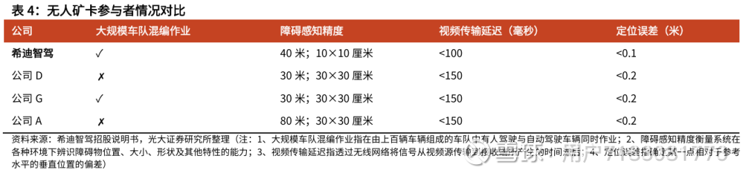 目前市场参与L4无人矿卡的主要以希迪智驾为主的产品供应商、以及同业的供应+运营商为主。我们认为,产品销售模式规避了运营+管理风险,有助于进一步聚集产品与提升研发效率。我们认为,希迪智驾的障碍感知、定位精度等指标均更优,具备更强的一体化软硬件适配能力,可实现更高毛利率。