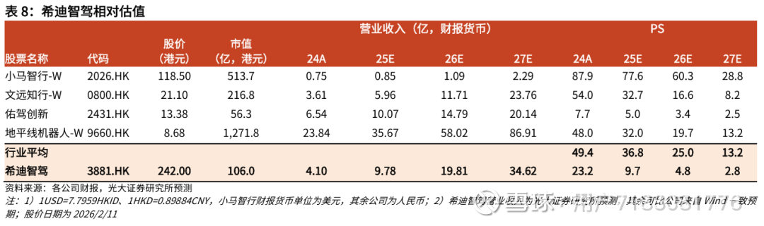 希迪智驾当前股价对应2026E 4.8x PS。当前可比公司估值2026E约25.0x PS;其中,小马智行估值较高主要因为所处Robotaxi行业远期市场规模更大(据弗若斯特沙利文测算到2030年中国Robotaxi市场规模可达2,808亿元)、且公司业务进展迅速(广州城市UE已实现转正),剔除小马智行后可比公司估值2026E约13.3x PS。