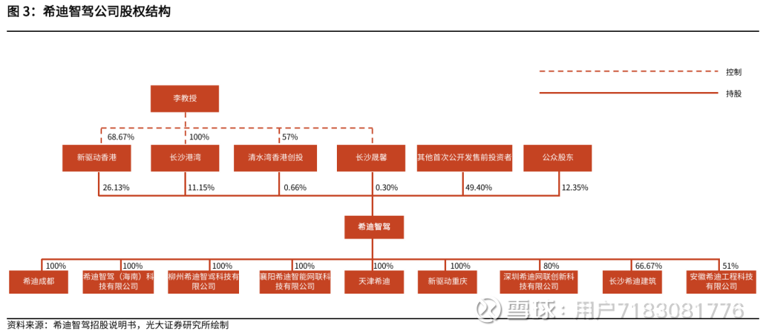 公司股权架构清晰且控制权集中。李泽湘教授通过控制新驱动香港(持股 68.67%)、长沙港湾(100%)、清水湾香港创投(57%),实现对希迪智驾的实际掌控;在希迪智驾的直接持股中,新驱动香港(26.13%)、长沙港湾(11.15%)等关联主体合计占据核心份额,其他首次公开发售前投资者(49.40%)与公众股东(12.35%)则共同构成股权结构的补充部分。同时,希迪智驾通过 100% 控股等方式布局了成都、湖南等多地子公司,形成了覆盖全国的业务运营网络,股权与业务架构的协同也为公司发展提供了支撑。