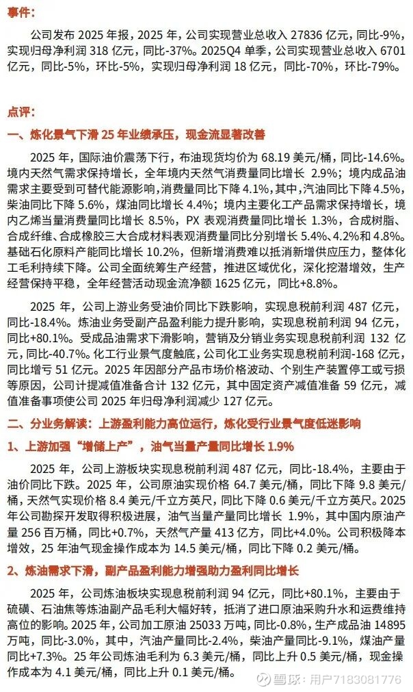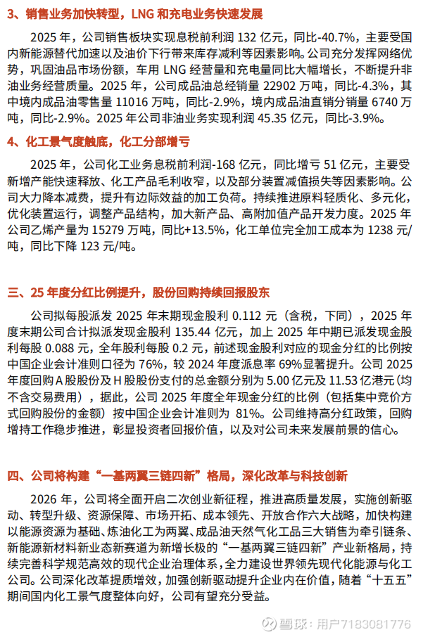 报告标题:《炼化景气下滑业绩承压,提升分红比例积极回报股东——中国石化(600028.SH/0386.HK)2025 年报点评》