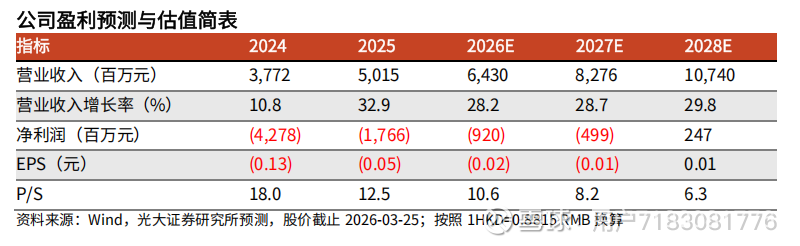 盈利预测、估值与评级:考虑到公司生成式AI业务持续高速增长,上调26-27年收入预测3%/5%至64.3/82.8亿元,新增28年收入预测107.4亿元; 综合考虑:1)管理组织效率优化;2)研发费用持续高投入率,调整26-27年净利润为-9.2/-5.0亿元(上次预测为-2.3/+1.7亿元),新增28年净利润预测2.5亿元。生成式AI打开中长期收入成长空间,维持“买入”评级。