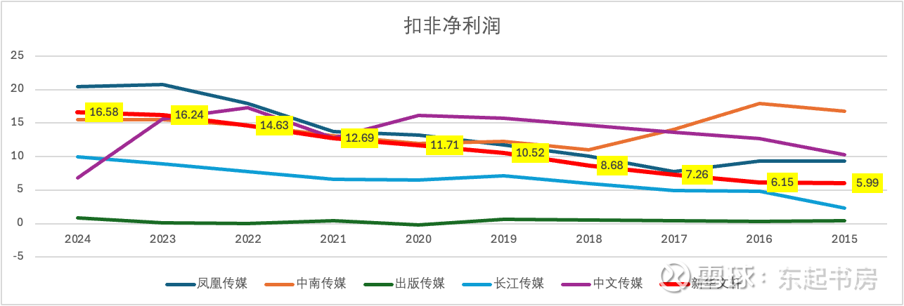 由于这类传媒公司大多有金额可观的权益工具投资,为衡量各公司在主营业务方面的盈利表现,我们仅仅比较各自的扣非净利润。2015-2024年期间,与营业收入保持持续增长的情况相对应,新华文轩期间的扣非净利润保持了同样的持续向上增长的良好态势。同时期,保持类型持续增长良好态势还有长江传媒和出版传媒。不过,长江传媒同一时期营业收入呈现的是负增长的态势,而出版传媒同一时期营业收入基本保持稳定,两公司的扣非净利润与营业收入表现出不同的走势。具体原因有待进一步分析。