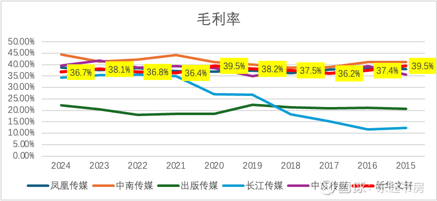 2015-2024年期间,新华文轩的毛利率基本保持稳定,大致在37%-40%区间。与大多数同类公司的毛利率不相上下。其中,中南传媒公司的毛利率期间每年都位列第一。