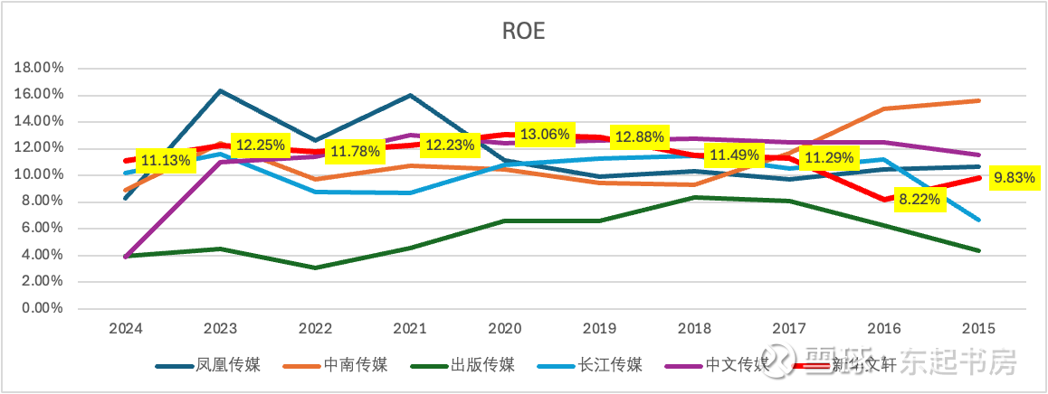 新华文轩净资产收益率过去10年大致在9%-13%区间,基本稳定。2024年ROE为11.13%,高于其他同类公司。自2019年以来,新华文轩ROE基本保持在前二。