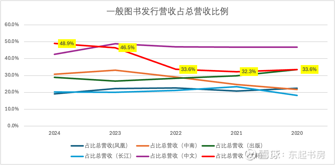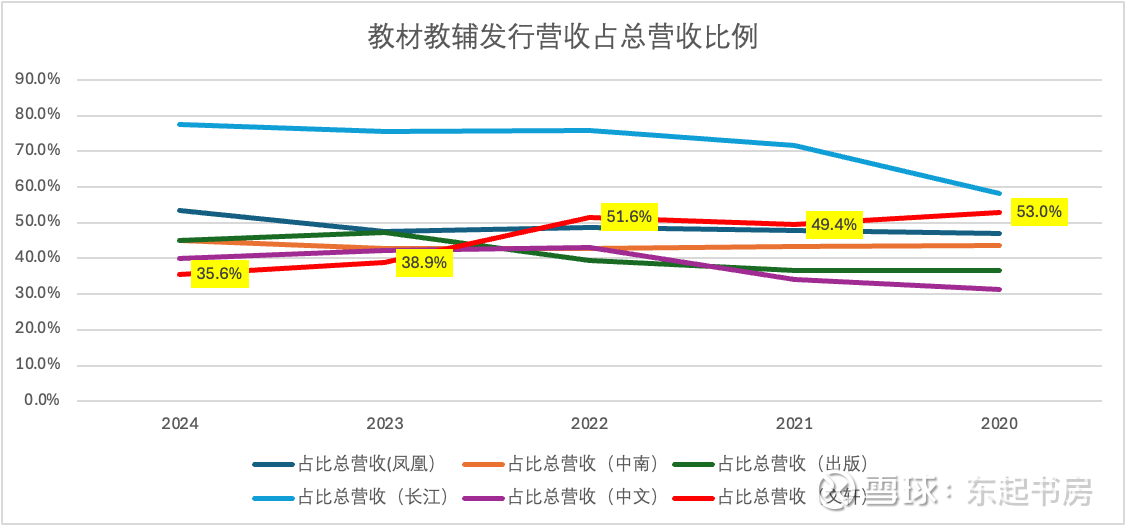 在2020-2024年期间,新华文轩在总营业收入持续增长的情况下,教材教辅发行营收占比逐渐下降,特别是在2023年下降十分明显,从2022年的占总营收51.6%下降到2023年38.9%。同一年,一般图书发行营收占比从2022年的33.6%跳升到46.5%【但2023年年报有关教材教辅销售收入的信息与2022年年报关于教材教辅销售收入的信息相互矛盾,有待新华传媒公司的确认】。