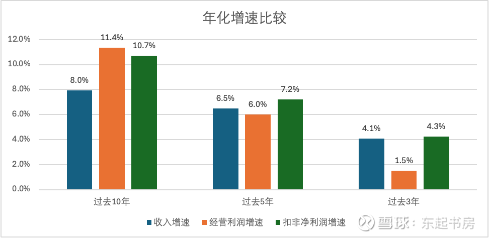 更为糟糕的是,扣非净利润与营收复合增长放缓的趋势不一致,扣非净利润复合增长率与营收复合增长率的差距不断缩小,表明企业的盈利能力在不断下降!近10年/5年/3年,营收复合增长率与扣非净利润复合增长率的差距分别为2.7%、0.7%和0.2%。增速在减缓,盈利能力下降更迅速。这一点从经营利润复合增长与营收复合增长趋势不一致更容易明显看到!