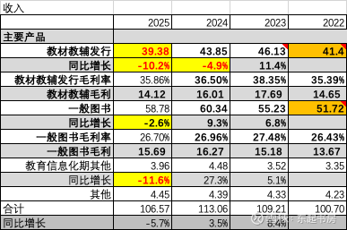 营收117.3亿元,同比下降4.9%,全年4个季度营收同比都录得负增长。其中,营收负增长主要来自教材教辅出版和发行业务。受中小学在校学生人数持续下降以及学校为学生减负、严格控制教辅(个别省份如江西省教育厅不再统一向学校推荐和组织订阅教辅)的影响,教材教辅发行业务2025年营收只有39.38亿元,同比下降10.2%,降幅加大,毛利率也小幅下跌了0.6%。在未来几年,教材教辅业务营收和毛利率恐怕仍将持续下降,特别是营收规模,下降几乎是铁板钉钉的事件。与此同时,一般图书未能保持持续增长势头,2025年一般图书发行营收58.78亿元,同比下降2.6%,毛利率基本持平。一般图书市场处于完全竞争的格局,并且受到电子阅读的巨大冲击,未来要取得营收增长绝非易事。新业务教育信息化发展也不顺利,2025年营收只有3.96亿元,同比下降11.6%。因此,总体来看,新华文轩主营业务的未来前景不佳,持续下跌基本上是比较确定的事情。